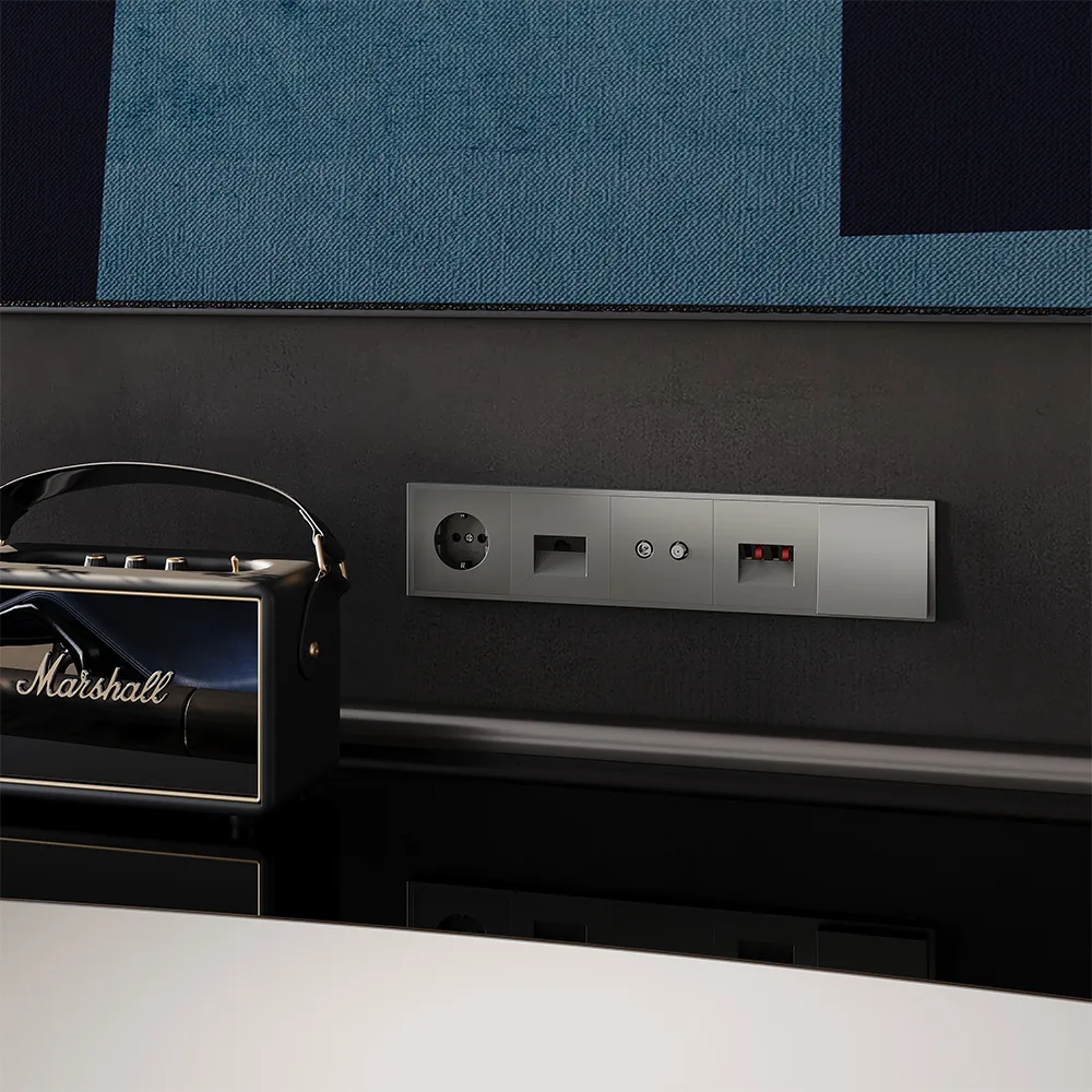 Вывод кабеля легко интегрируется в любую композицию на стене — рядом с розетками, выключателями или мультимедийными устройствами, создавая цельную, продуманную и чистую электрическую инфраструктуру.